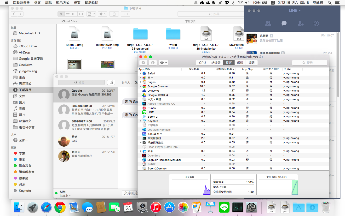 我在使用電腦時喜歡打開網頁瀏覽器(Safari)、聽聽音樂軟體(iTunes)、當然也要開著電腦版的 LINE 以免錯過任何朋友或家人的訊息。