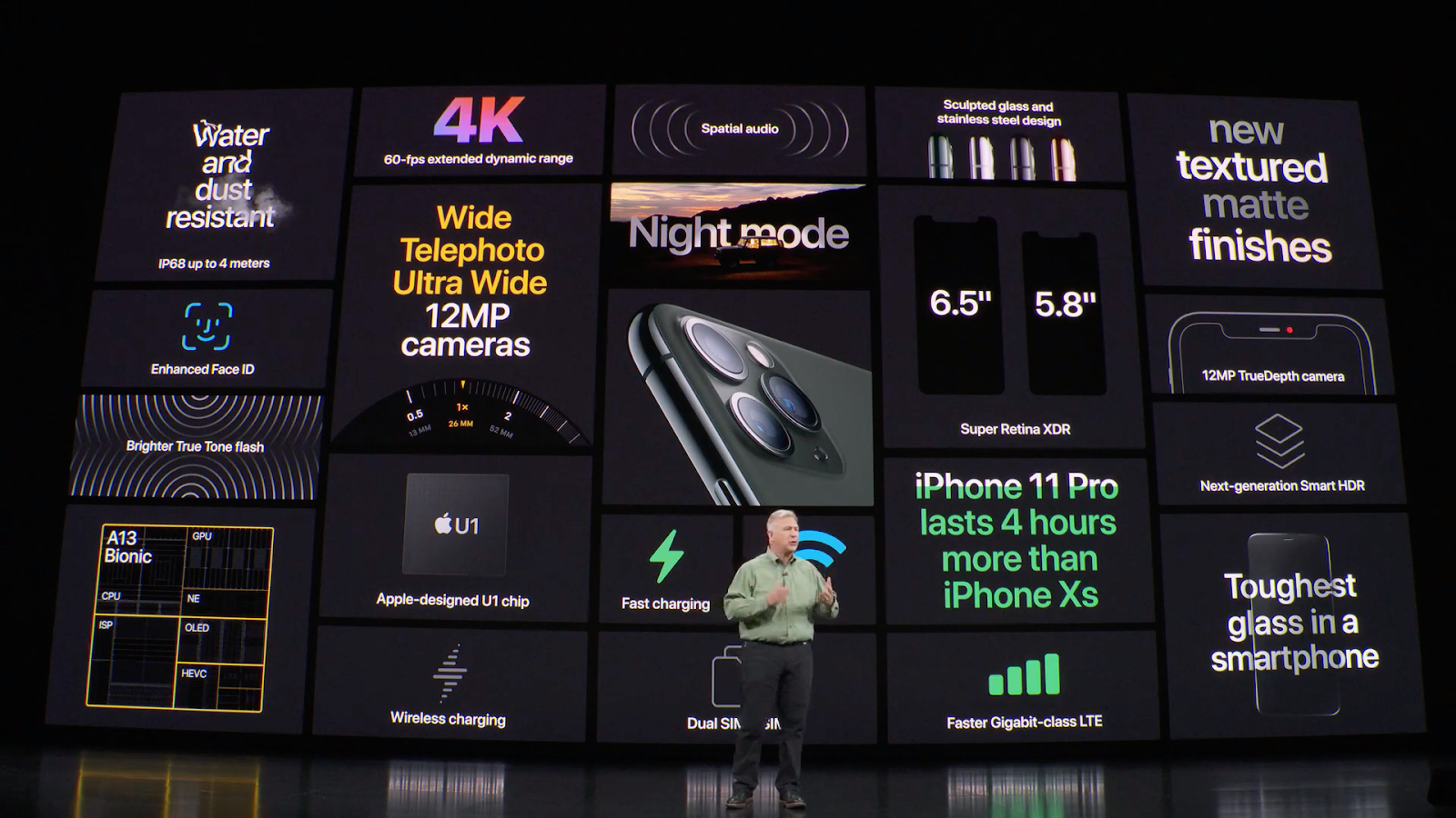 iPhone 11 Pro 比 iPhone Xs 多了 4 小時的電池續航力;iPhone 11 Pro Max 比 iPhone Xs Max 則是多了 5 小時,可說是 iPhone 系列歷來最大的進步。