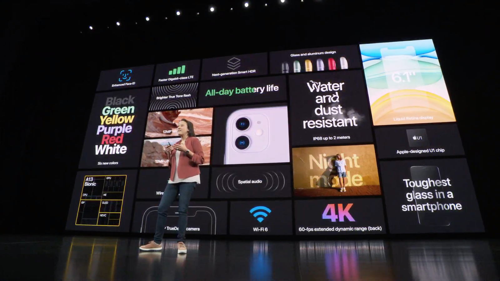 首先公布的是 iPhone 11,這次一口氣出了 6 個顏色,包括黑色、綠色、黃色、紫色、白色及紅色。