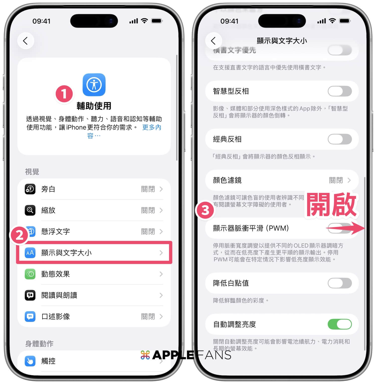 打開「設定」 App > 點選 「輔助使用」,進入 「顯示與文字大小」,找到「顯示器脈衝平滑」的開關,打開即可。