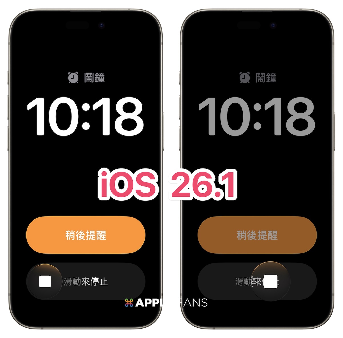為了解決這個問題,Apple 在 iOS 26.1 把關閉鬧鐘的方式,變成要「滑動」才能停止鬧鐘。