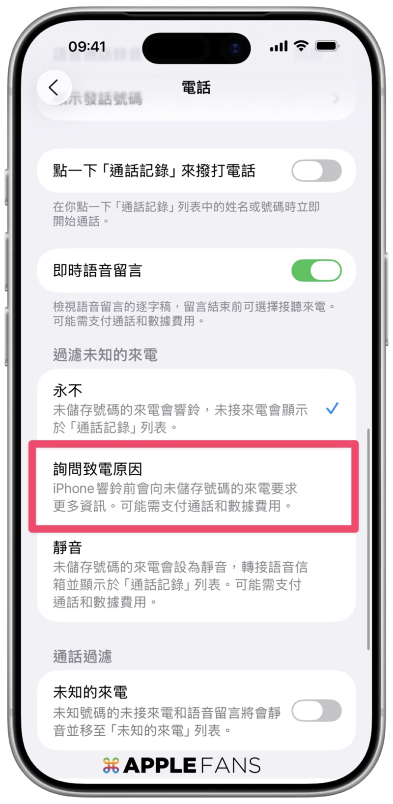 - 找到選項 「過濾未知的來電」,選擇「詢問致電原因」