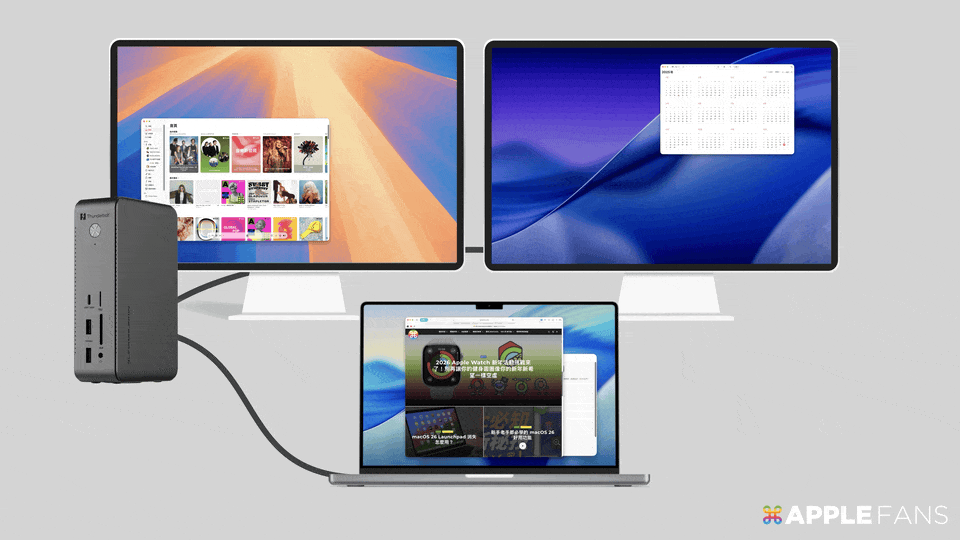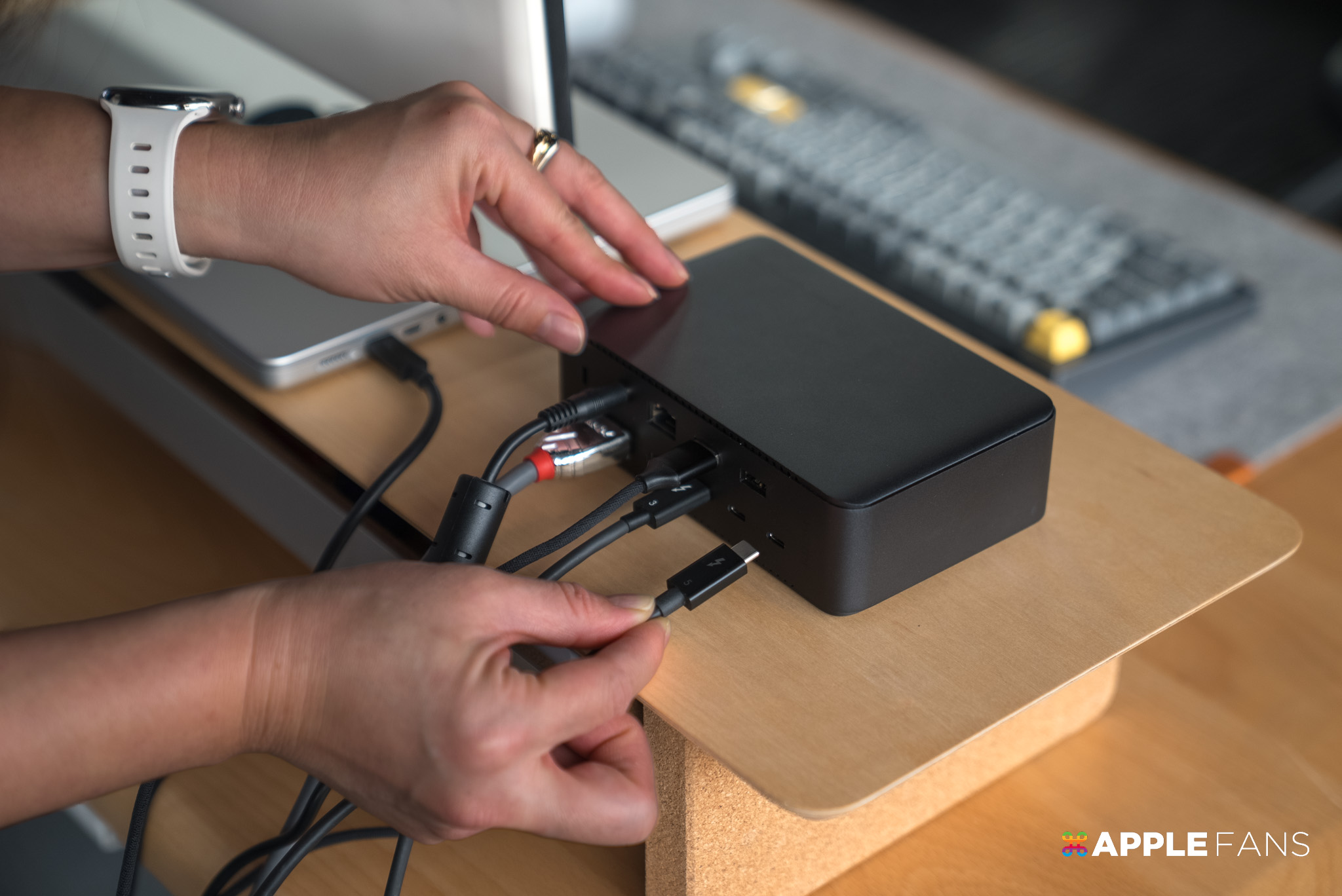 只要一條 Thunderbolt 5 連接到電腦,不論同時接上多個螢幕、外接 SSD 或其他裝置,系統反應都是穩定、流暢的,這就是 Thunderbolt 5 提供更高的雙向頻寬彈性與 160W 智慧供電所帶來的優勢,也是前一代 Dock 很難同時兼顧的。