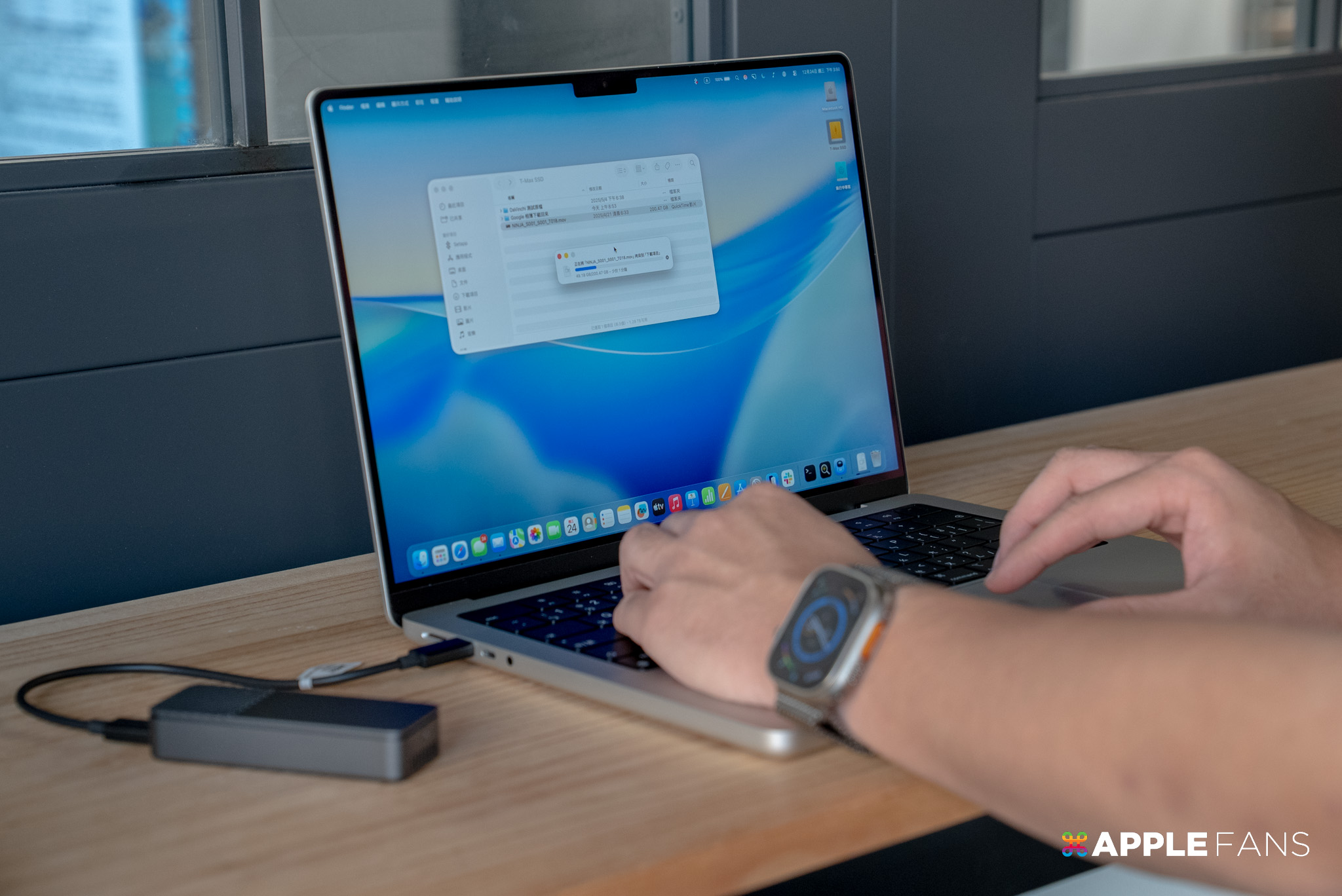 我們實際拿 M4 Pro MacBook 來測試,發現 T-Max(搭配 Samsung 990Pro 2TB) 不管是讀取還是寫入的速度,都跟電腦內建的 SSD 非常接近,用起來很順,完全沒有一般外接硬碟那種卡頓的感覺。