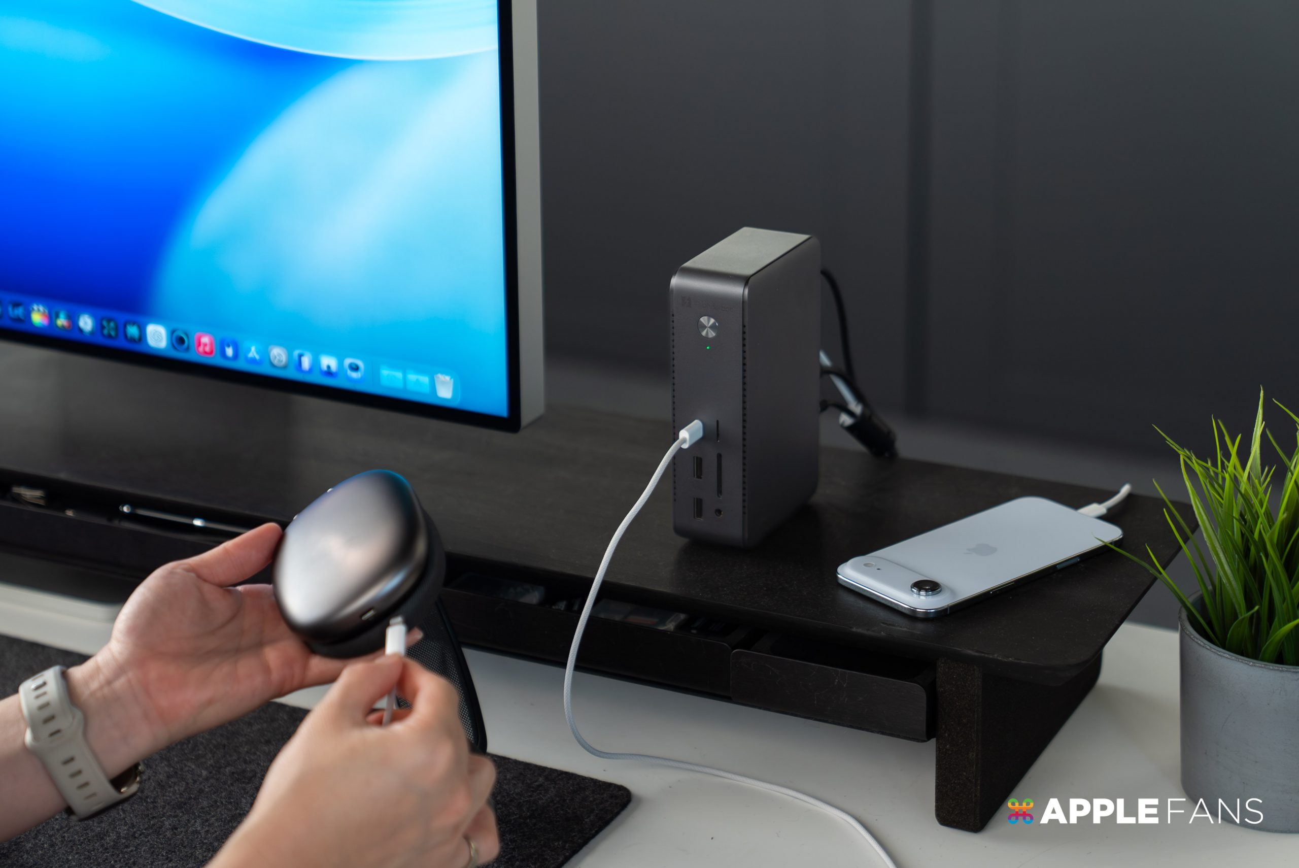另一個很多人會忽略、但實際很實用的地方是:就算沒接筆電,TD2 也能單獨當充電站使用。你下班把筆電帶走,桌上的 TD2 依然可以幫 iPhone、iPad、耳機或其他裝置充電,不用再額外準備一顆又一顆充電器。