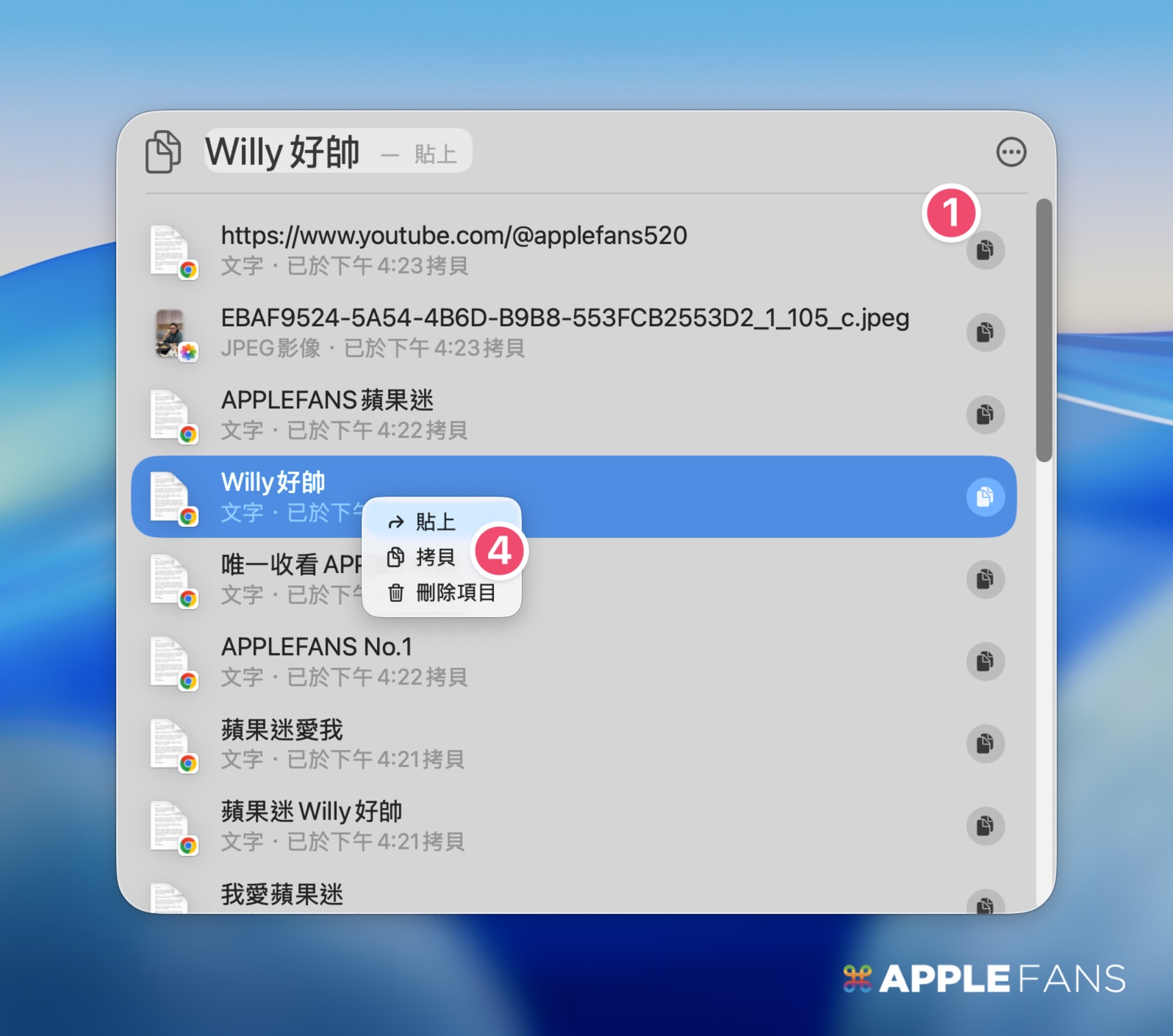 只要按下 Cmd + C 複製完的內容,通通都會在 Tahoe 剪貼簿裡的歷史記錄裡面。想要取用貼上的方式有四種: