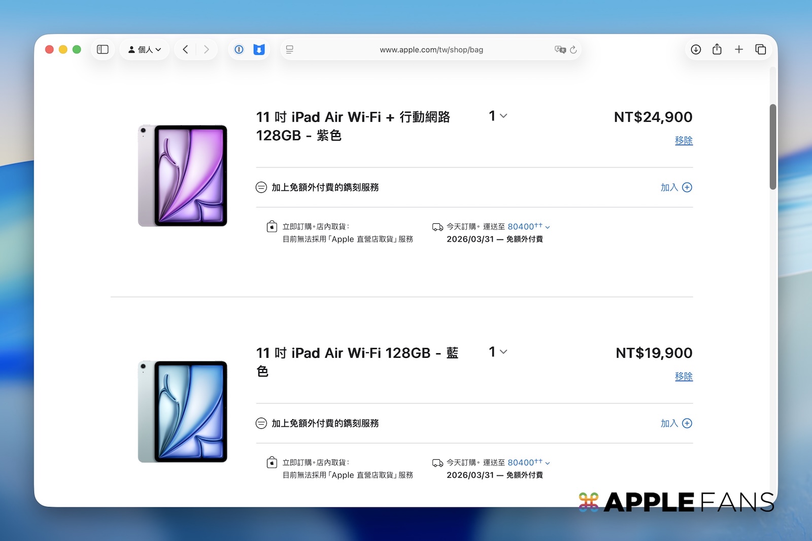 - 11 吋 iPad Air:Wi-Fi 版 NT$19,900 起;行動網路版 NT$24,900 起。