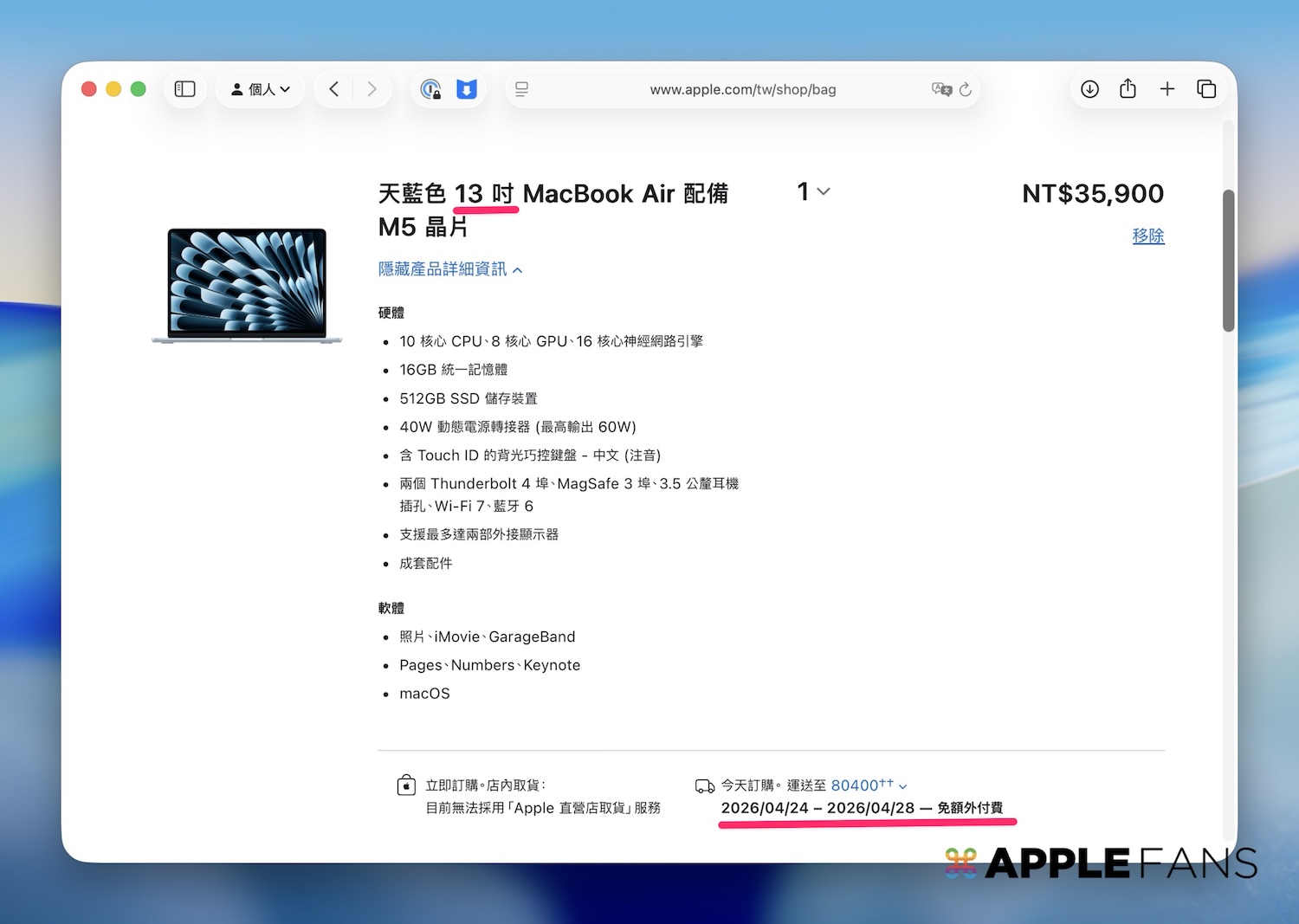 做為例行性更新的 M5 MacBook Air,在外觀造型上並沒有做任何大幅度的更動,最重要的當然就是升級成最新的 M5 晶片。而這台 M5 晶片 MacBook Air 終於開放訂購了,現在下單,不管是 13 吋或者 15 吋,最快都可以在 4 月 24 日送達。