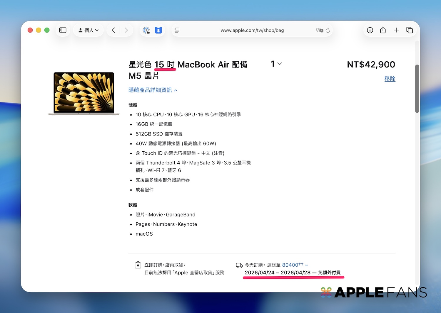 在今年三月初正式推出這台搭載 M5 晶片的 MacBook Air,雖然國外早已開賣,但台灣因為要等 NCC 電檢審核,一直沒能在首波名單中。現在 NCC 終於通過,這台 MacBook Air M5 台灣開賣 了,最快可以在 4 月 24 日送達。