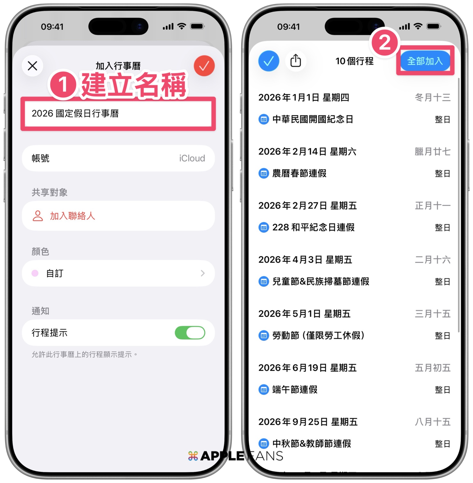 行事曆名稱可以自行定義,像小編就是使用「2026 國定假日行事曆」,建立完成之後,開啟以下的連結,就會看到所有行程,再選擇「全部加入」。