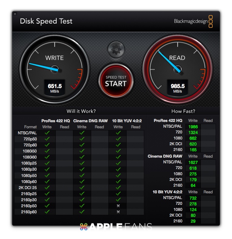 Disk Speed Test 還是快了一點,不過數據差不多,寫入有 651 MB/s,讀取則有 985 MB/s。