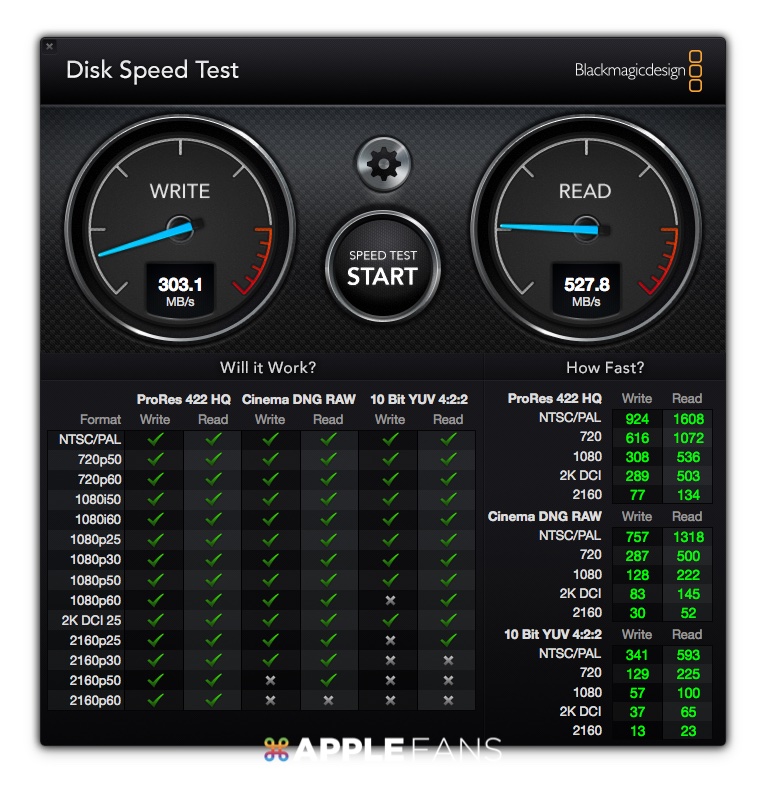換成用 Disk Speed Test 來測的話稍微高了一些,寫入為 303 MB/s,讀取則為 527 .8 MB/s,這個速度大概也就是一般 SSD 的平均速度了,再快也快不到哪去。