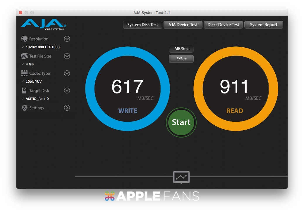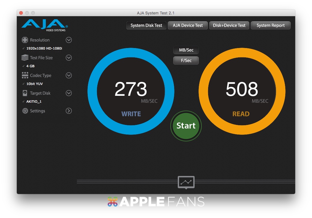 我們先來看看正常一顆 SSD 的傳輸速度有多快,這邊以 4GB 1080p 的檔案用 AJA System Test 來測,這顆 SSD 的寫入速度為 273 MB/s,讀取速度為 508 MB/s。