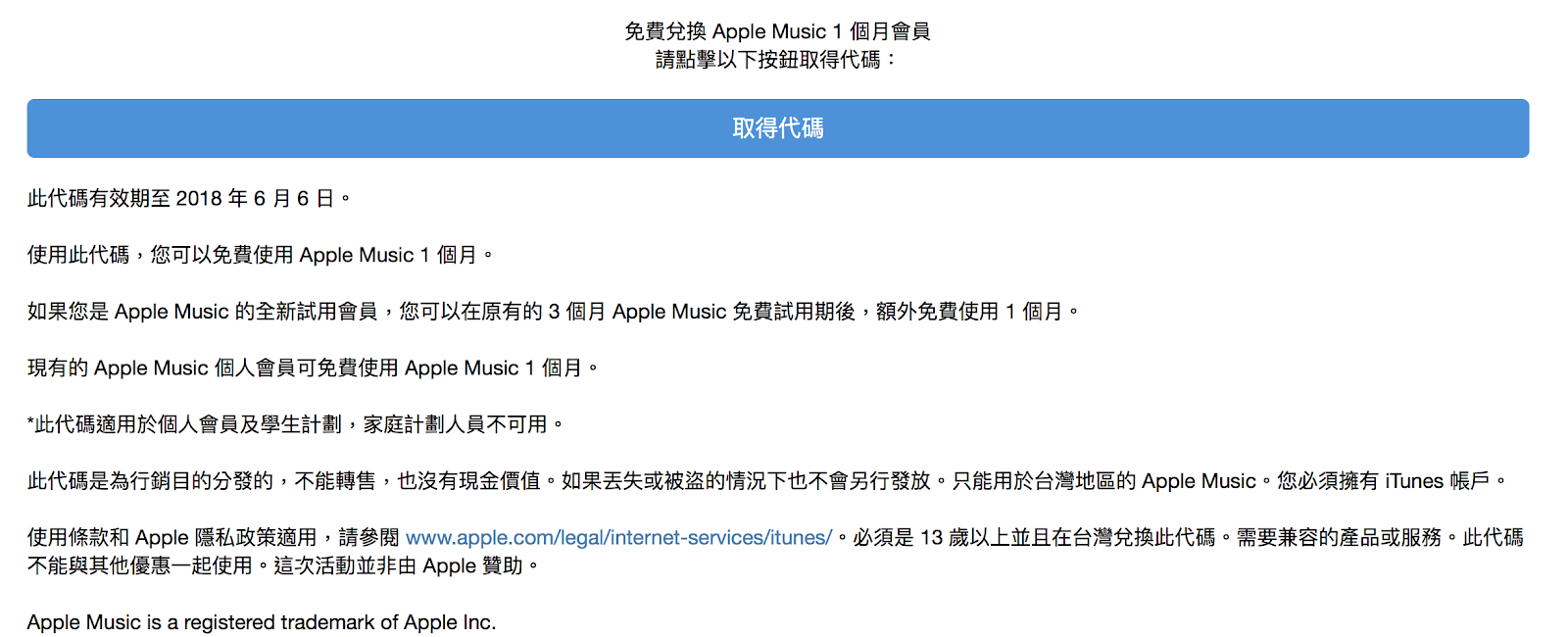 再點選上方的【Apple Muisc 免費聽】後,頁面便會跳轉到兌換頁面。當中包含本次活動的規則說明,請各位詳閱之後再兌換。