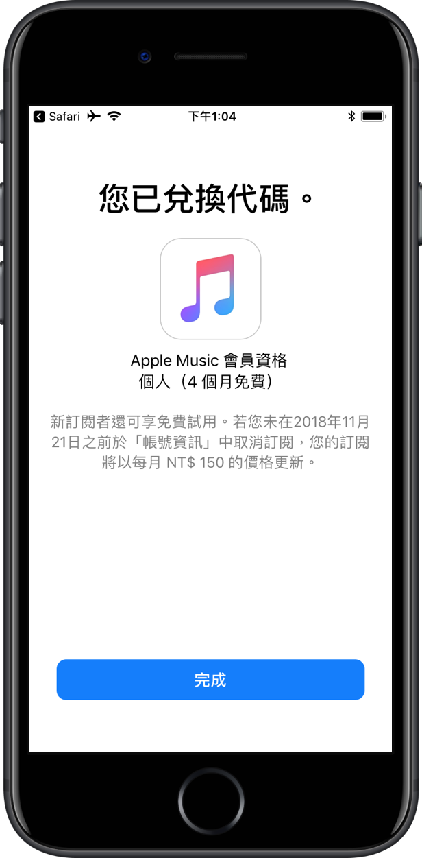 按下【完成】後,就獲得 Apple Music 免費訂閱一個月了!