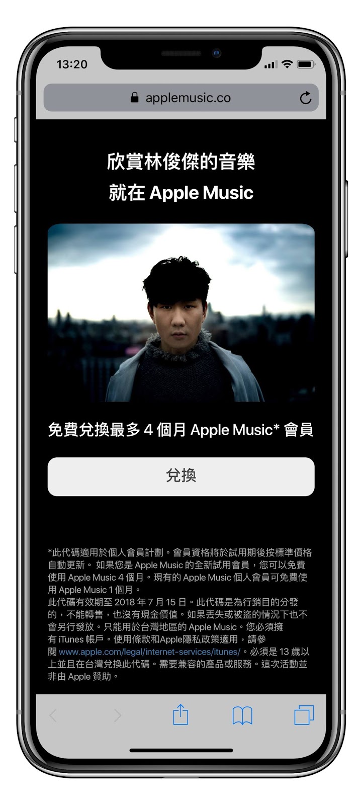 首先,來到活動宣傳頁面,可以看到 JJ 林俊傑帥氣的照片,底下有「免費兌換最多 4 個月 Apple Music 會員」以及【兌換】的按鈕。