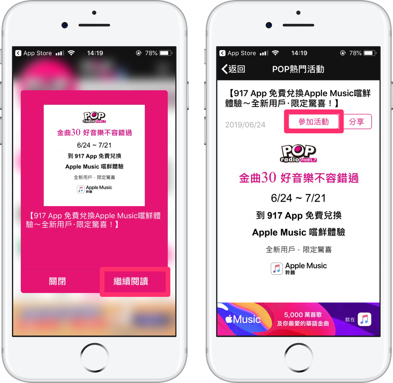 開啟 App 後點選彈跳視窗上的【繼續閱讀】,接著在 POP 熱門活動上點擊【參加活動】。