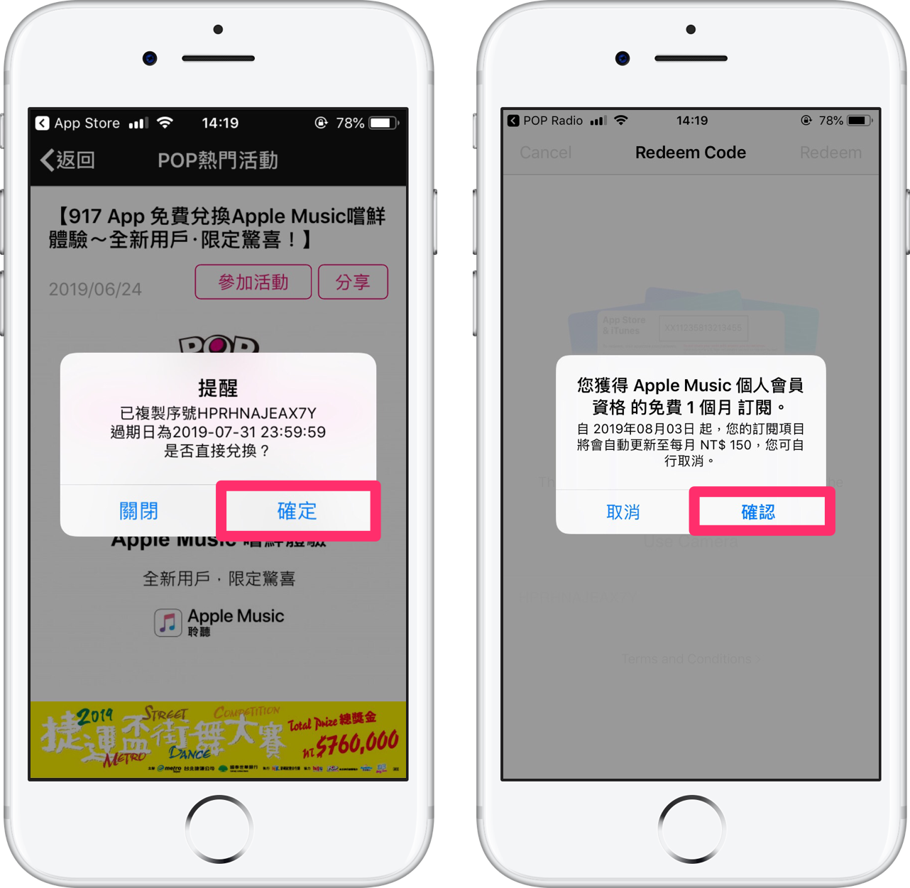 即會跳出刷費贈送的序號,請按下【確定】,接著會自動跳至 Apple Music 序號兌換頁面,按下【確認】。