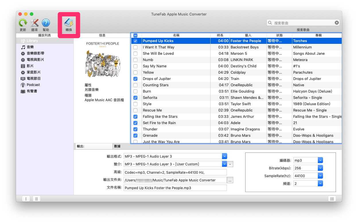 確定輸出格式,最後按下 TuneFab Apple Music Converter 主畫面上方工具列的【轉換】按鈕,即可將 Apple Music 音樂轉檔成 MP3。