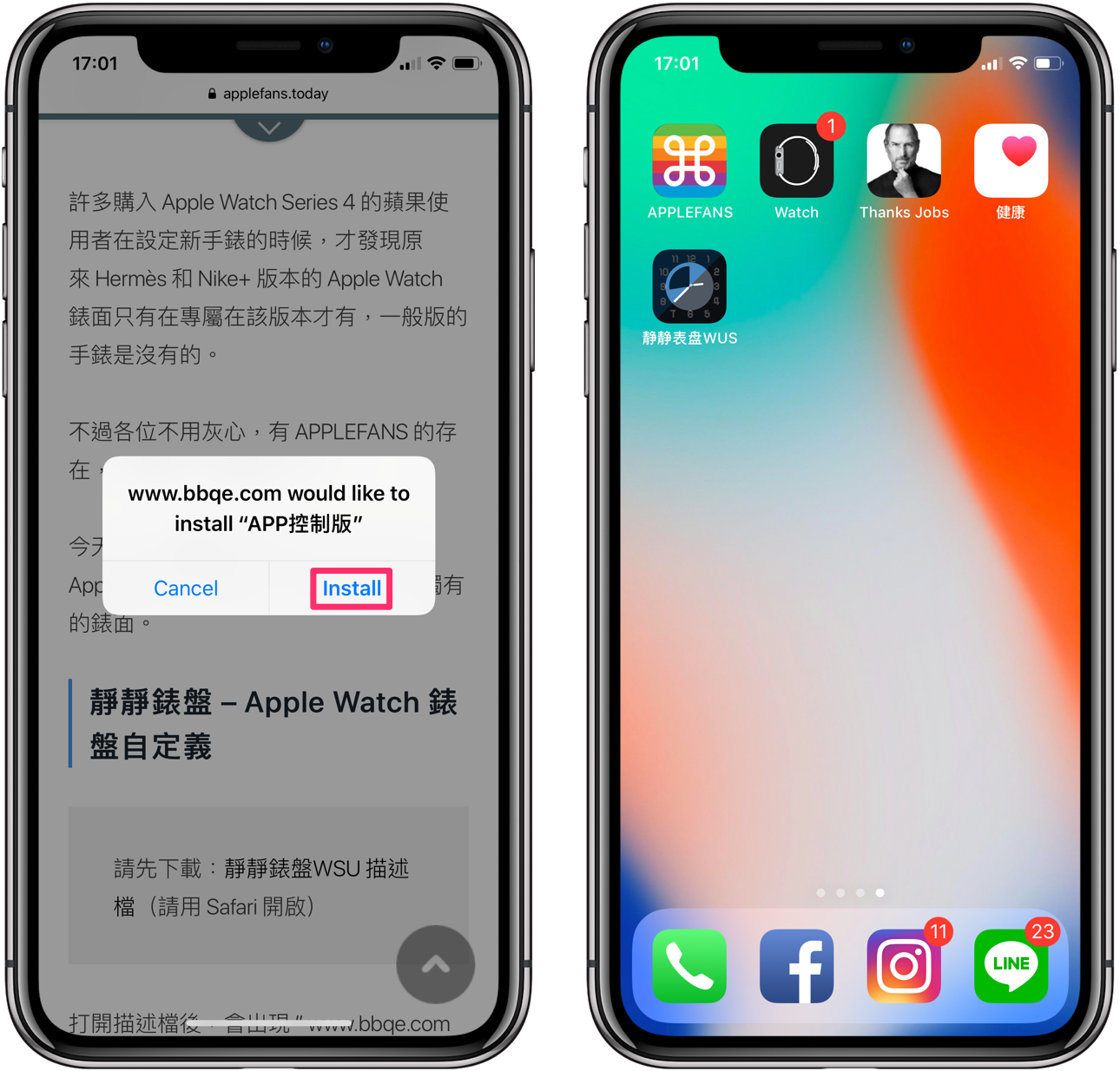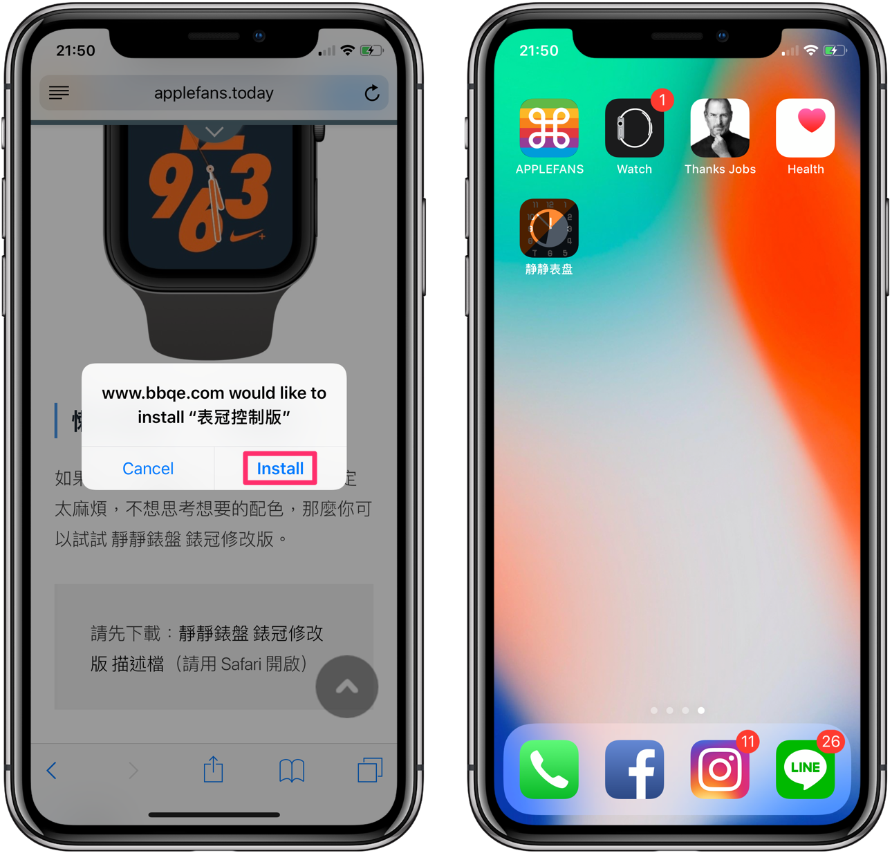 描述檔打開後,會出現 ” www.bbqe.com would like to install ”表冠控制版“ “,請點【Inatall】,點選完後《靜靜錶盤 錶冠控制版》就會在桌面開始下載。
