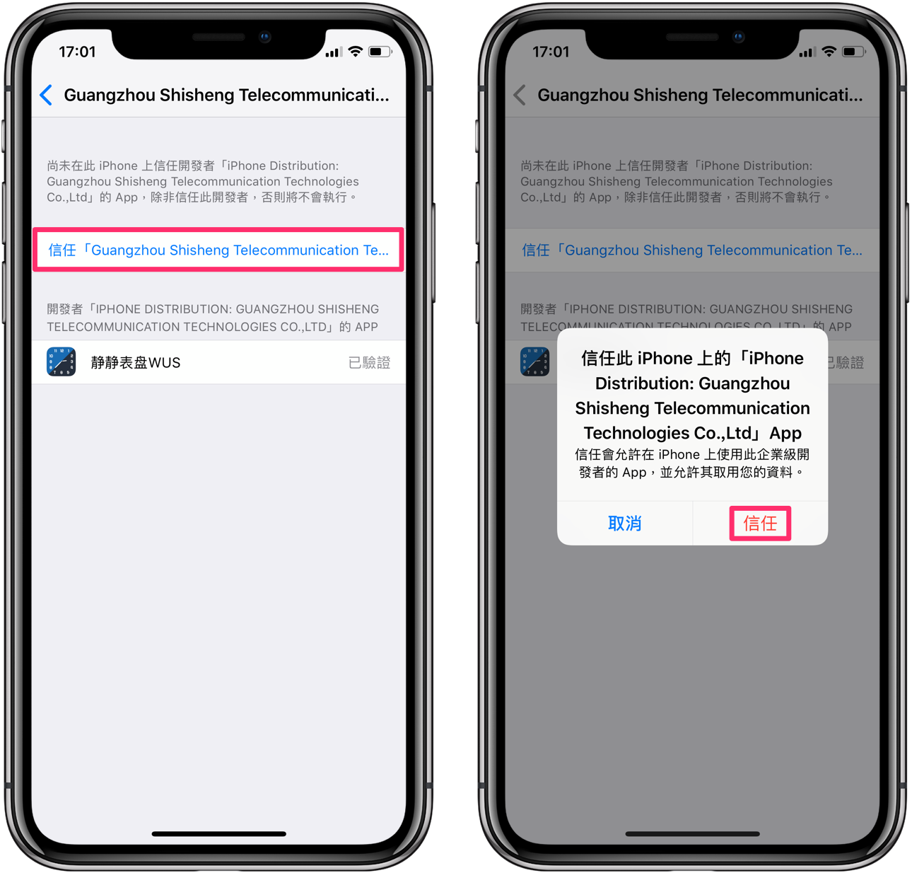 請點選 【信任「Guangzhou Shisheng Telecommunication Technologies Co.,Ltd」】,再點【信任】。