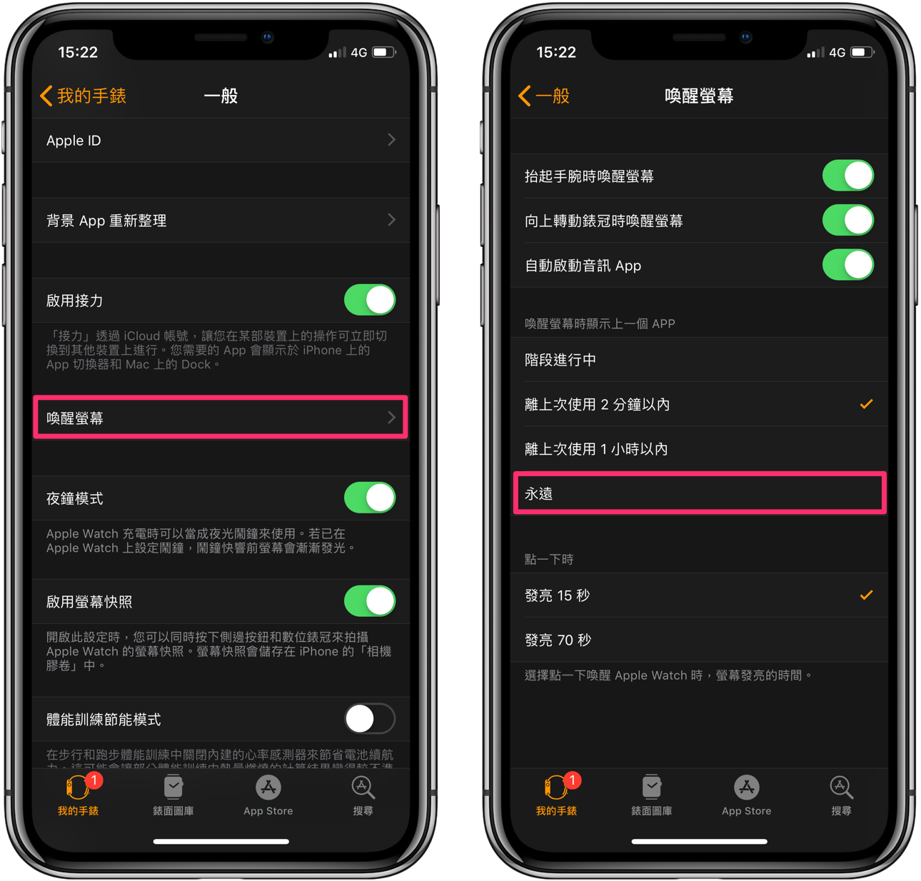 打開《Watch》App,接著到「一般」 >「 喚醒螢幕」,往下滑至 喚醒螢幕時顯示一個 App,請選擇 【永遠】。