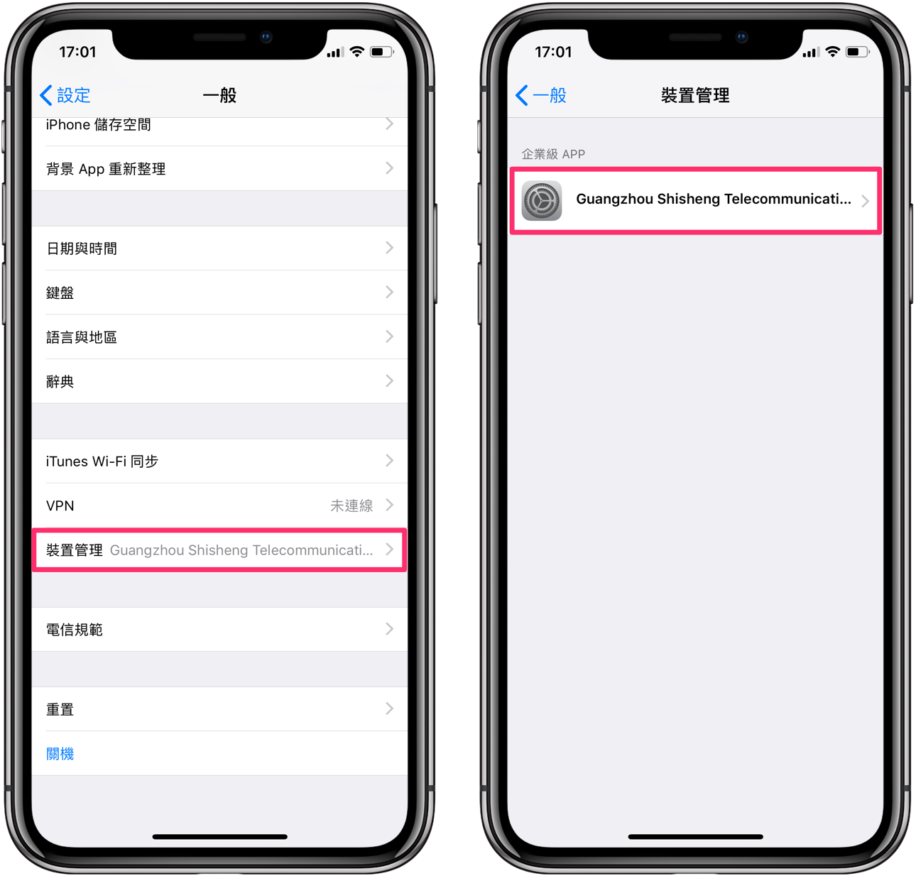 接著到「設定」 >「 一般」,往下滑至 裝置管理,進入後請選擇【Guangzhou Shisheng Telecommunication Technologies Co.,Ltd】。