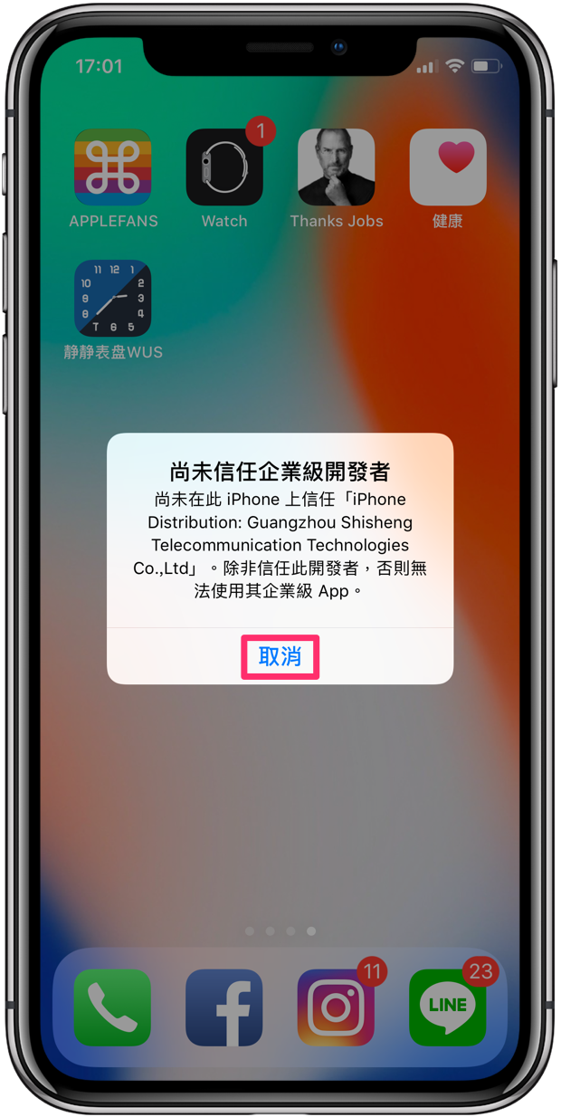 點開《靜靜錶盤 WUS》App 後,會出現 “尚未信任企業級開發者”,請選【取消】。