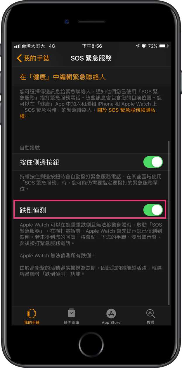 往下滑之後就能看到「跌倒偵測」功能的開關,只要將它打開就完成了。