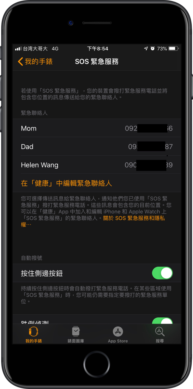 進到裡面後可以看到有緊急聯絡人資料的設定,如果你希望在出狀況時救護人員有人可以及時聯絡的話,就順手設定一下吧!