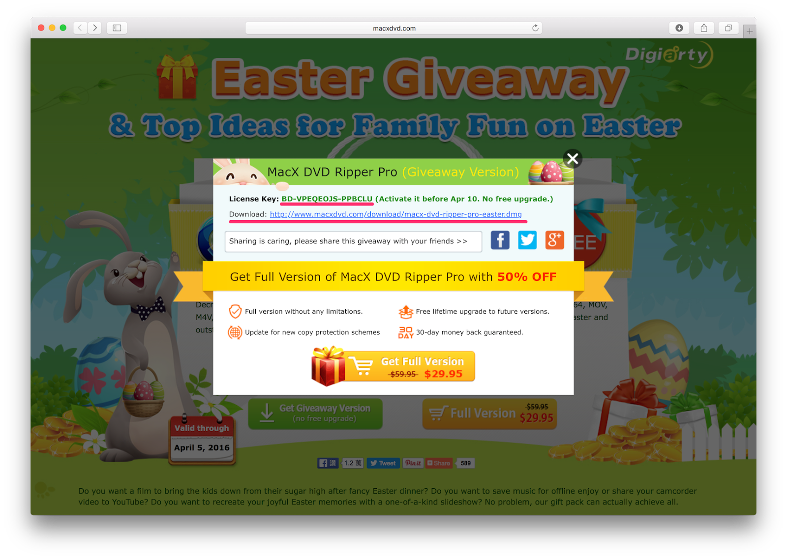 別擔心,剛好一年一度的復活節即將到來,Digiarty Software 也借由此機會推出了 2016 年度的第一個官方限免活動,原價 US $59.95 的 MacX DVD Ripper Pro 將免費送給你!