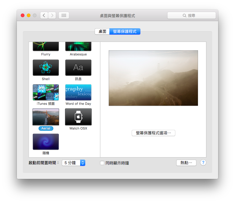 進入【系統偏好設定】>【桌面與螢幕保護程式】後,進入【螢幕保護程式】頁面,即會出現畫面設定的選項。