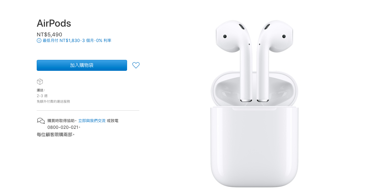 從先前的 6 週變成了 2~3 週,終於不需要再等上一個月才能拿到貨。不過為了避免先前的悲劇再度發生,蘋果也限制了每個人的購買數量,一人最多只能訂購兩隻 AirPods。