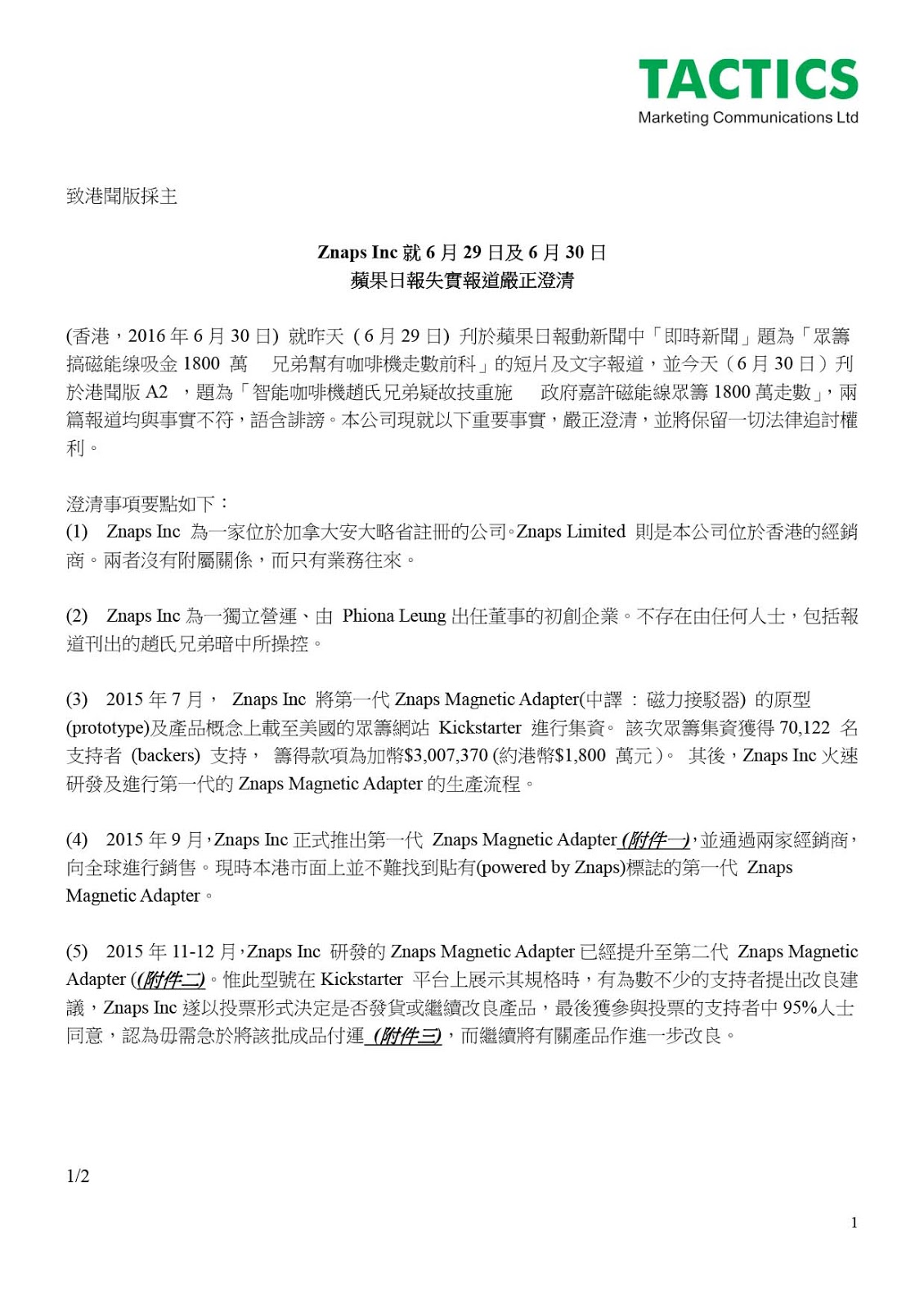 今天,ZNAPS 發佈了一份至香港蘋果日報的通知信,要求更正報導,全文如下!