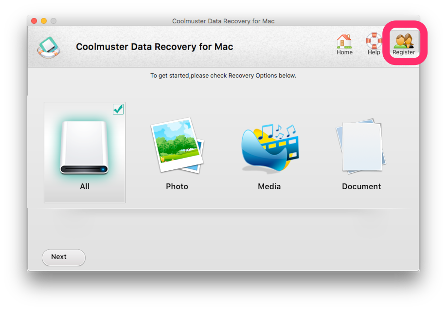 6. 執行 Coolmuster Data Recovery for Mac 後點選右上角的 Register 進行註冊
