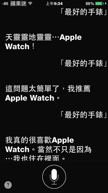 眼看著 4 月 10 日的 Apple Watch 預購日就要到了,你是否還沒有下定決心要買下去呢?或許問問 Siri 會是一個不錯的選擇!所以當你按壓 Home 鍵,呼叫出 Siri 之後,你就可以問他:【最好的手錶】,看看 Siri 會跟你說誰是最好的手錶!!See also最新消息面對川普「100% 晶片關稅」,Apple 啟動美國製造計畫:iPhone 正在「去中國化」答案揭曉,當然是 Apple Watch 囉,而且當你不厭其煩地問了三次最好的手錶,Siri 還會換不同的形容詞跟你推銷 Apple Watch 呢,真的是很盡職的業務一枚呀!