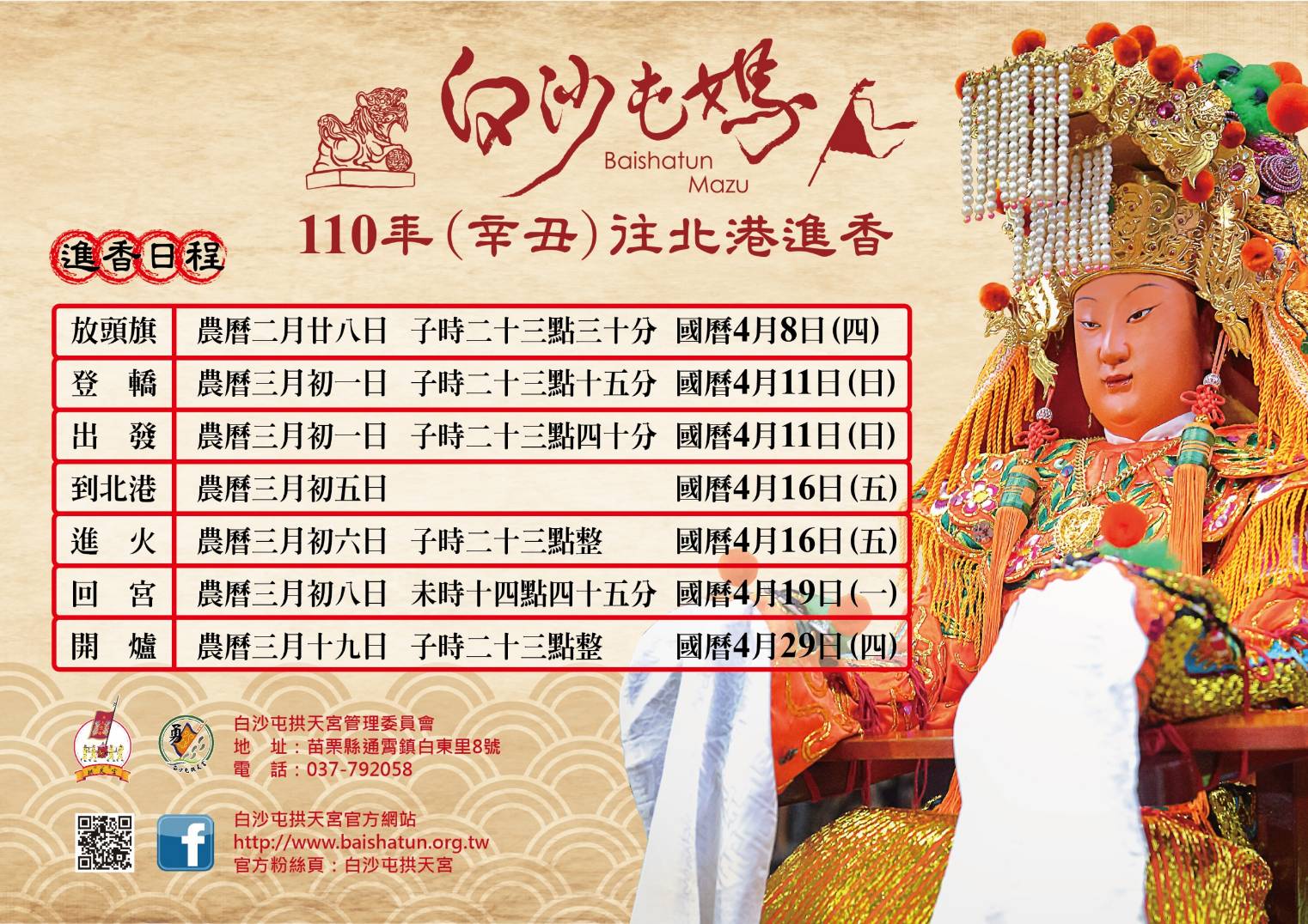 2021 年白沙屯媽祖準備起駕了!白沙屯拱天宮每年農曆 12 月 15 日擲筊決定來年媽祖徒步前往雲林進香日期、天數。經擲筊,擇定 2021 年白沙屯媽祖徒步往雲林北港朝天宮進香時程,擲筊結果 4 月 11 日深夜出發、4 月 19 日回宮。