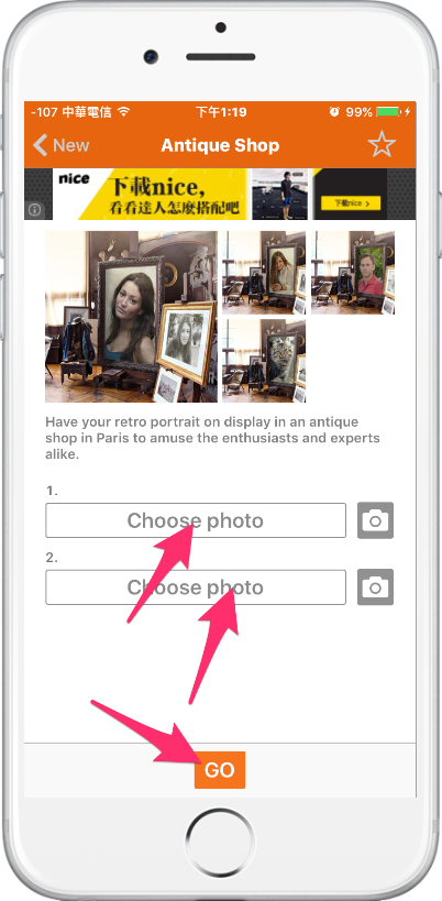 好吧,看了那麼多個相框,先選一個順眼的實際來做做看,點選相機的圖示,套用兩張照片,然後按下 Go 的按鈕。