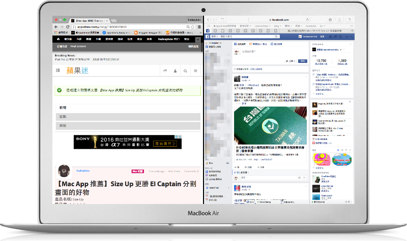 不過….還是只能夠左右分割罷了,如果要上下分割的話,EI Capitan 內建功能就沒有辦法了,今天蘋果迷applefans.today 就來補強這個缺點,來介紹一款可以上下左右左上左下右上右下分割,愛怎麼分就怎麼分的 Mac App~SizeUp 吧!!