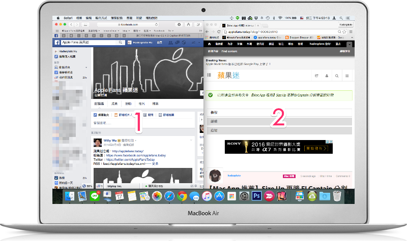這個就是左右分割畫面的結果(左 Safari,右 Chrome),與EI Capitan 不同的是他中間沒有一條黑線,交界處是很緊密地貼合的。