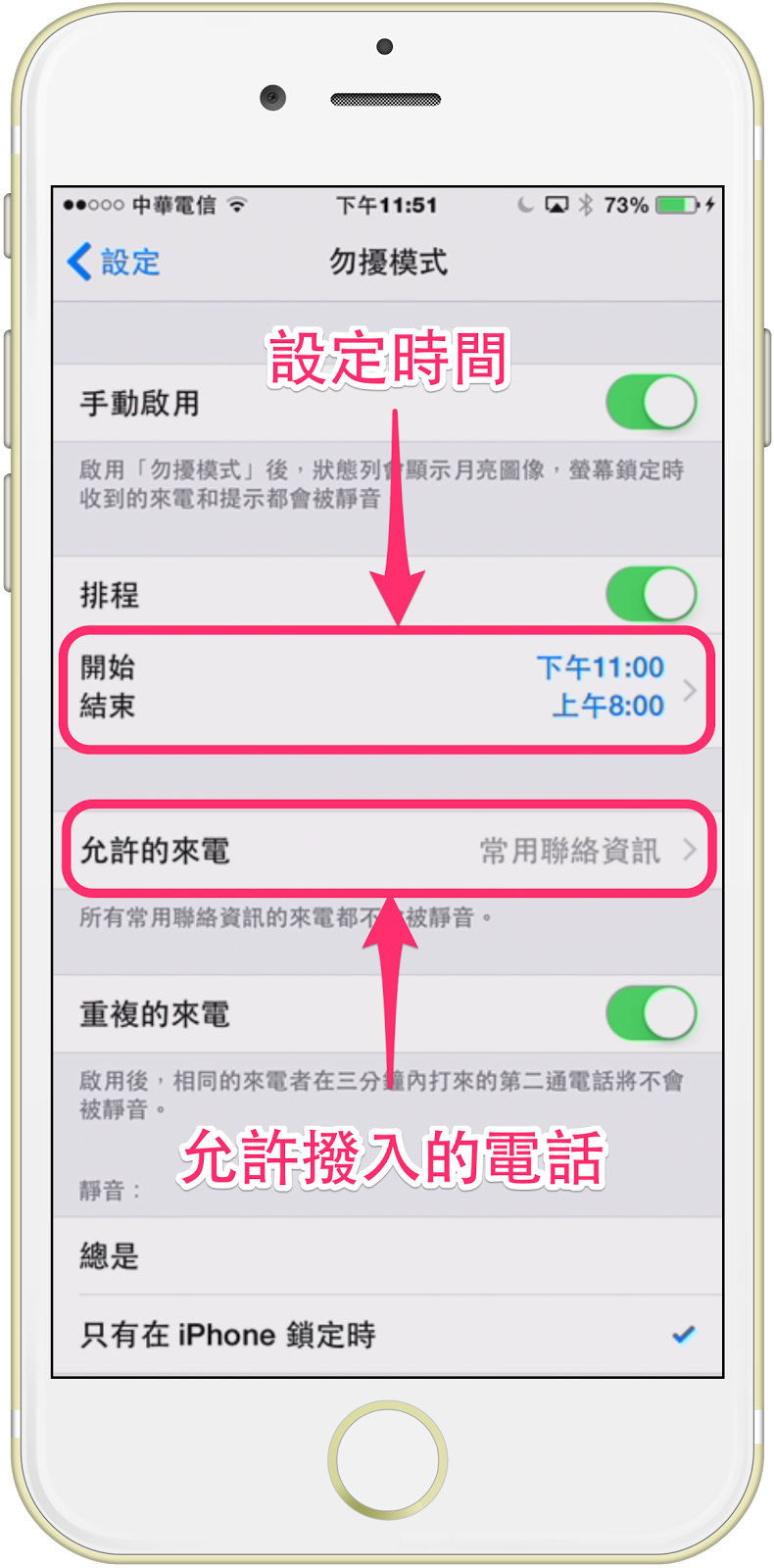▼從【設定】➤【勿擾模式】可以進入進階設定的畫面,可以設定勿擾的時間,還有允許可以撥入的對象: