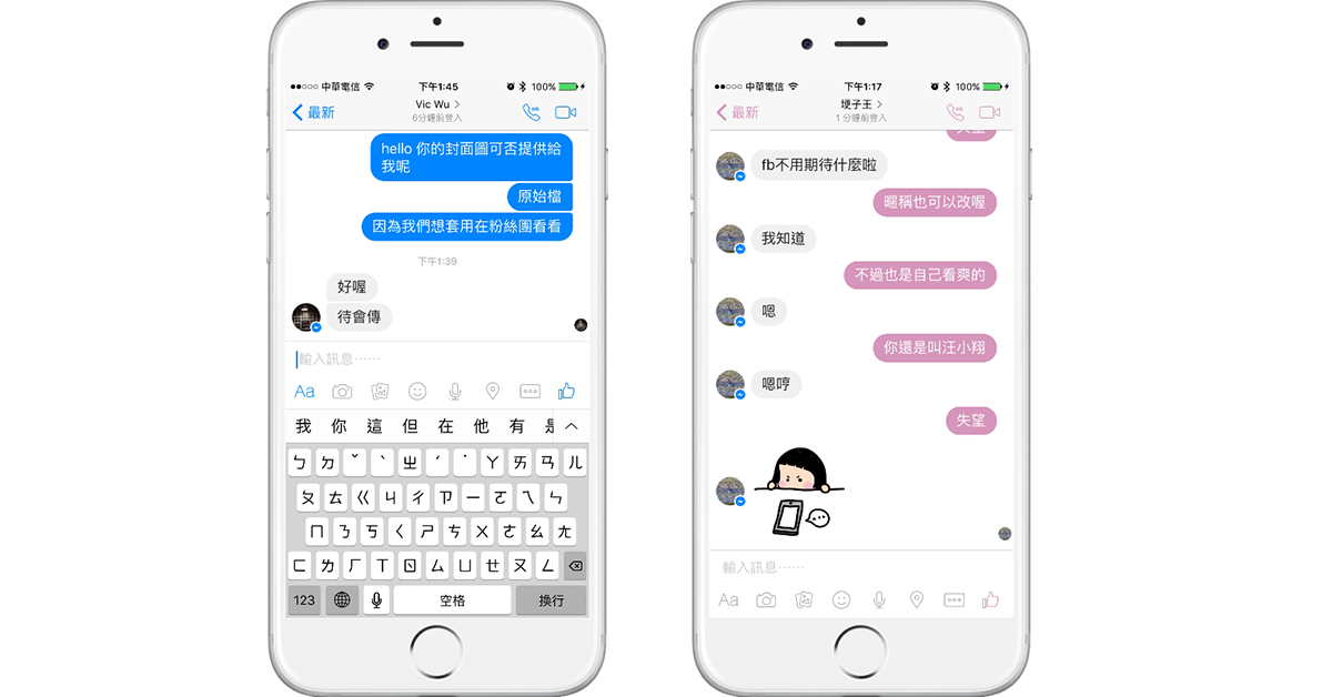 首先先來看看,原始的 Facebook Messenger 的樣貌,藍色的對話框,跟正常名稱顯示。
