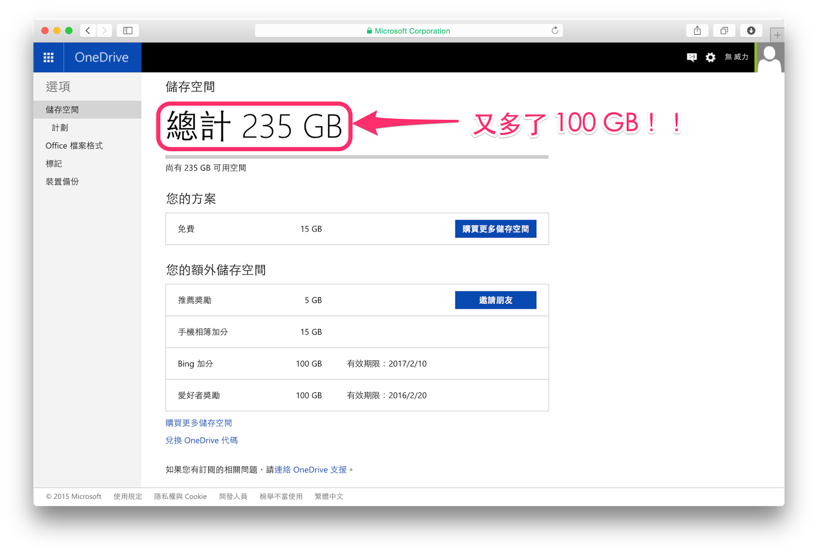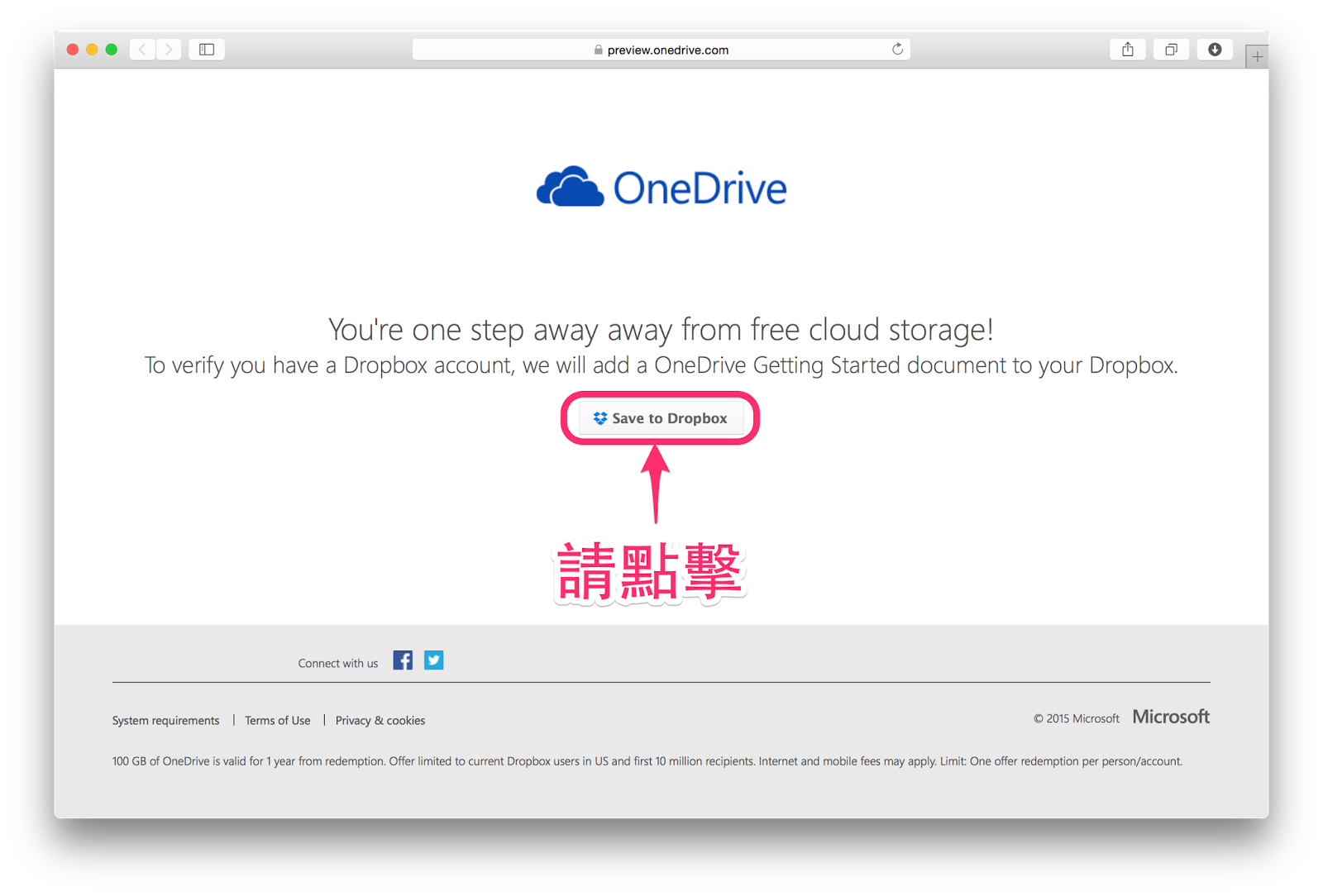 只要將 OneDrive 跟 Dropbox 做連結,就可以再多獲得額外的 100 GB 空間!