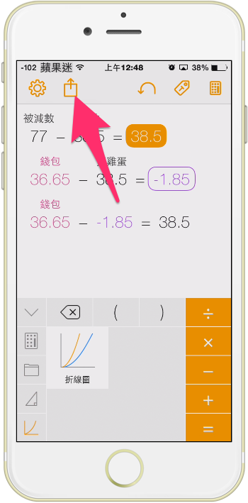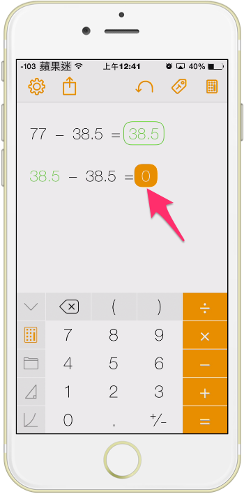 然後你直接再按一下 – 38.5 ,就會顯示 38.5 – 38.5 = 0