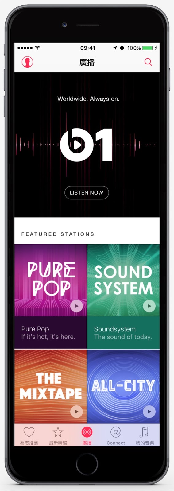 「廣播」區域可收聽至 iOS 7 就有的 iTunes Radio 以外,還有 Apple Music 獨家的24小時全球網路電台 – “Beats1”。