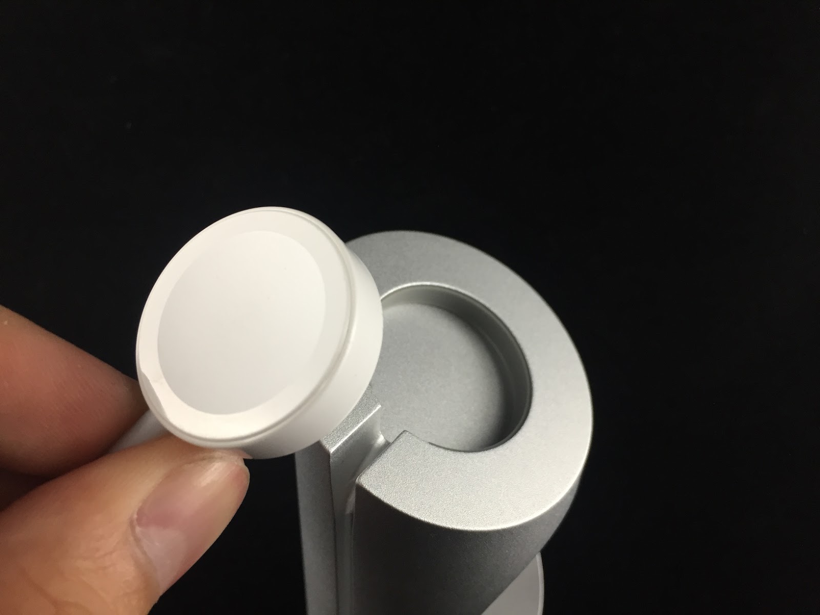 ▼ 塞進去的時候有點緊,不過不要怕,旁邊有橡膠襯裡保護著,狠狠的塞進去就合體了。充電頭的部份會比 TimeStand 稍凸出一些,方便吸附 Apple Watch