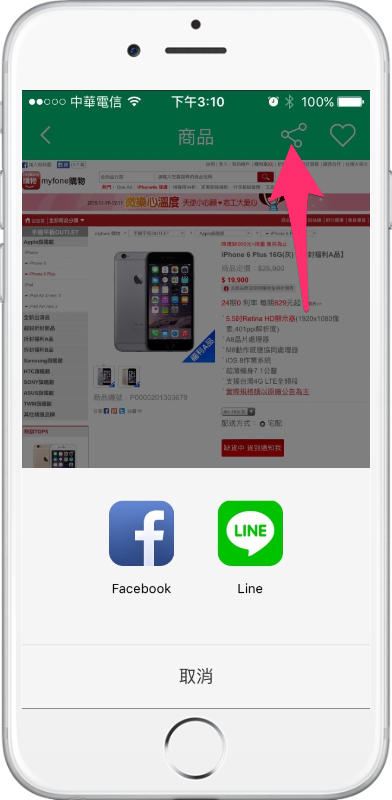 就會連結到產品的頁面去囉,這時候可以按下分享的按鈕,可以幫你分享到臉書跟 Line ,但是也就這兩個而已沒有其他的了。