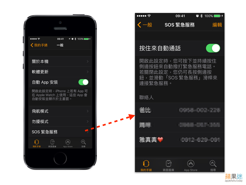 打開 iPhone 內建的「Watch」App,進入「一般」>「SOS 緊急服務」,即可從通訊錄中新增你的緊急聯絡人。當你使用這個 SOS 功能的時候,他們就都會接受到你的求救訊息了。