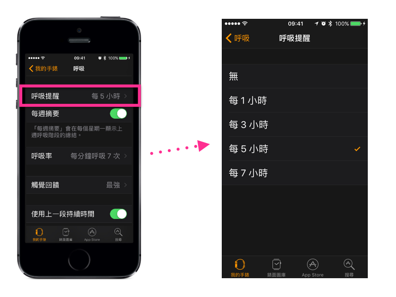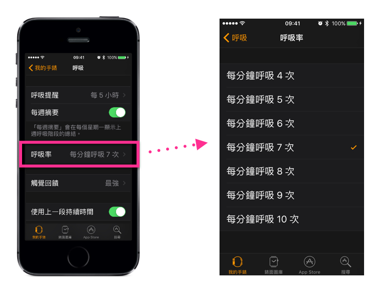 本篇的範例為一分鐘做7次深呼吸為主,但事實上,這個速率可由使用者自行調整,最少可以到每分鐘4次,最高可調整成每分鐘呼吸10次;在「呼吸」設定中點選「呼吸率」,即可選擇自己想要的速度了。
