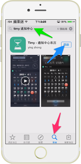 首先,我們一樣先進入 App Store ,並且按下搜尋(紅色箭頭),然後在上方搜尋欄打上 Timy 通知中心 (因為你只有打 Timy 是很難找到的),然後就可以按下取得啦(這是款免費 App ,請安心下載),或是直接按我下載!!
